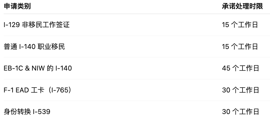 USCIS 对不同类别设定了明确的加急处理承诺时限。
